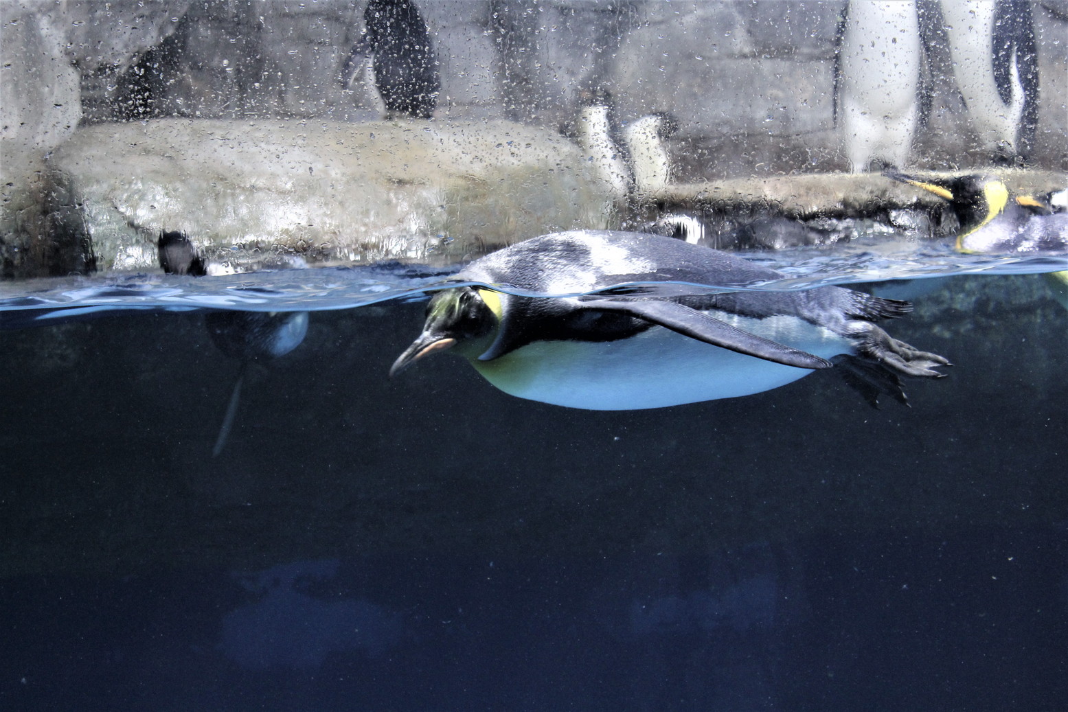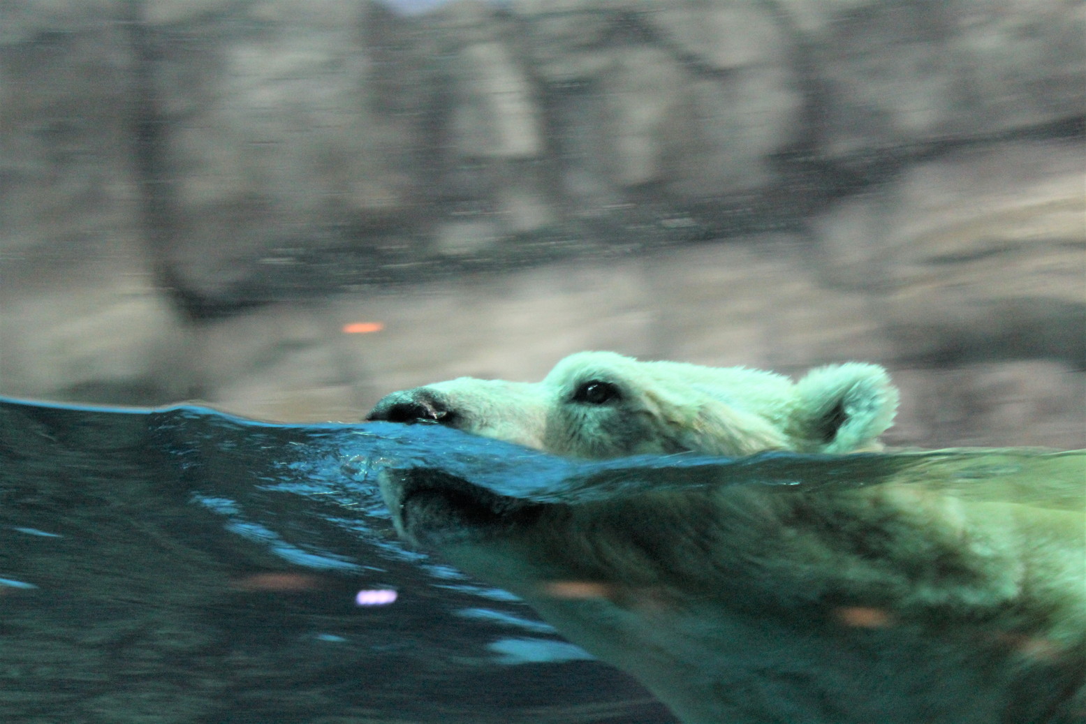 「氷の海にくらす動物たち」エリアでは、北極や南極などの寒い地域で暮らすホッキョクグマやセイウチ、ペンギンなどが暮らしています。気持ち良さそうに水槽を泳いでいる大きなホッキョクグマは、実は地球上で最も大きくて強い肉食動物なんです。