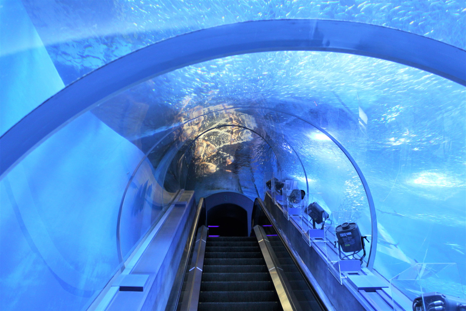 大水槽の隣には、まるで海の中にいるような感覚を味わうことができる「アクアチューブ」があり、3階へと続くエスカレーターになっています。