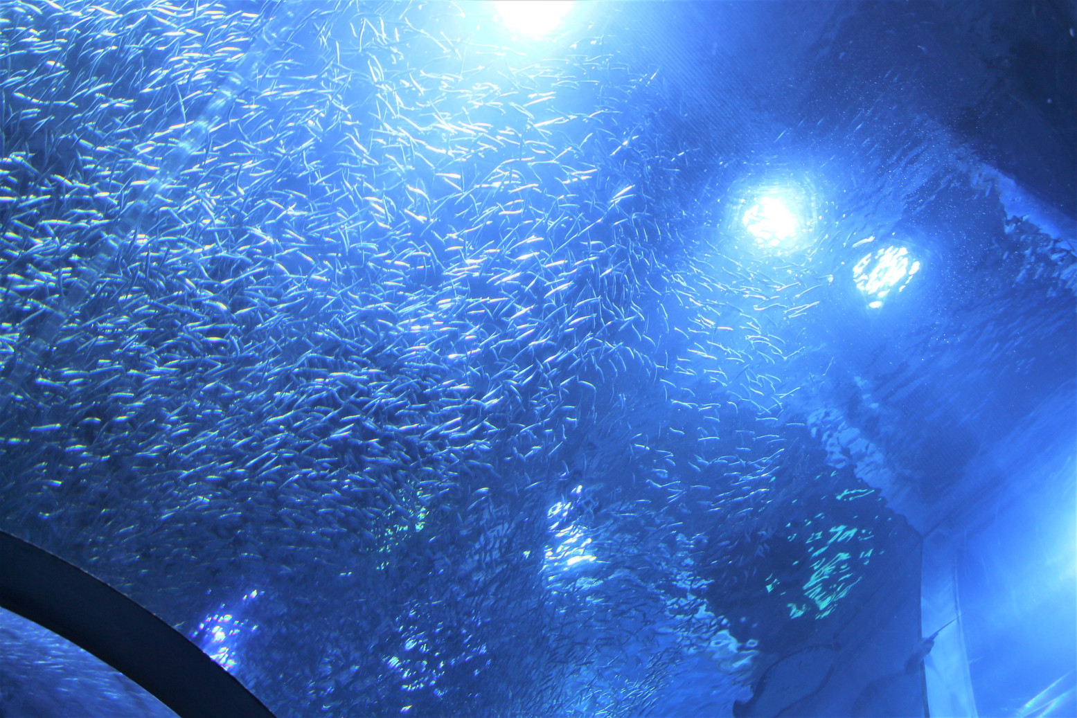 アクアチューブから天井を見上げると、イワシの群れが泳いでいる様子を見ることもできます。イワシショーをここから観賞してみると、違った一面が見られるかも!