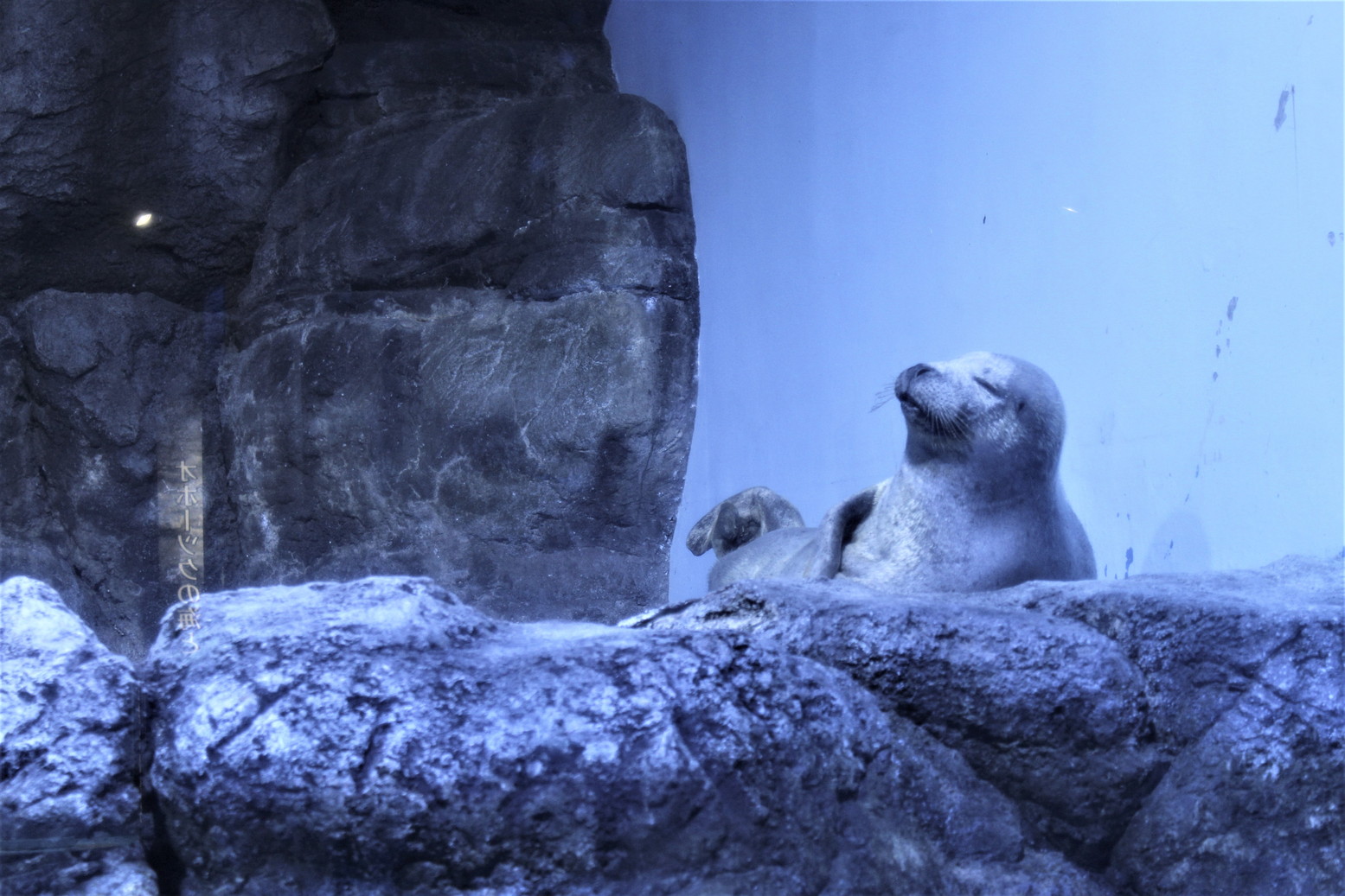 「海で進化した動物たち」エリアには、黒い斑点のゴマフアザラシとハイイロアザラシの2種類のアザラシが暮らしています。このときは、ちょうどゴマフアザラシがお昼寝をするところでした!うとうとしている様子がたまりません。