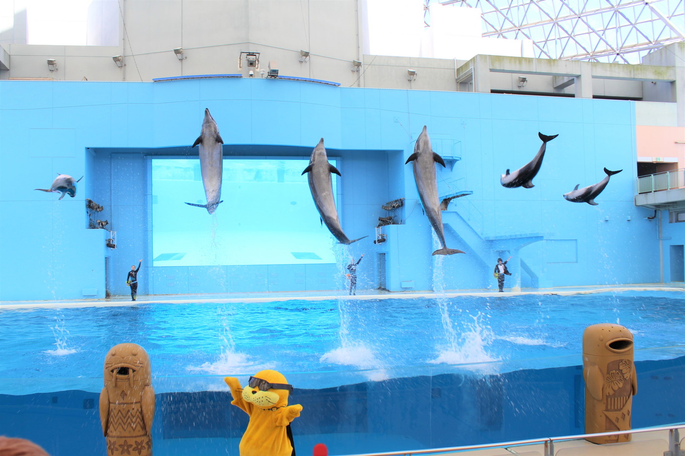 アクアミュージアムではさまざまなイベントが行われていますが、メインイベントは4階のアクアスタジアムで行われる「海の動物たちのショー」。一日に4~5回開催される海の動物たちのショーでは、イルカやクジラなどがアクロバティックな演技を見せてくれます。