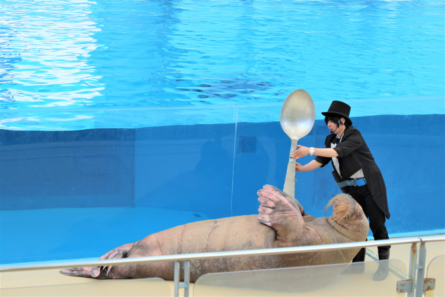 イルカやクジラだけでなく、北極圏に生息するセイウチもショーに参加。スプーン曲げに挑戦していました!