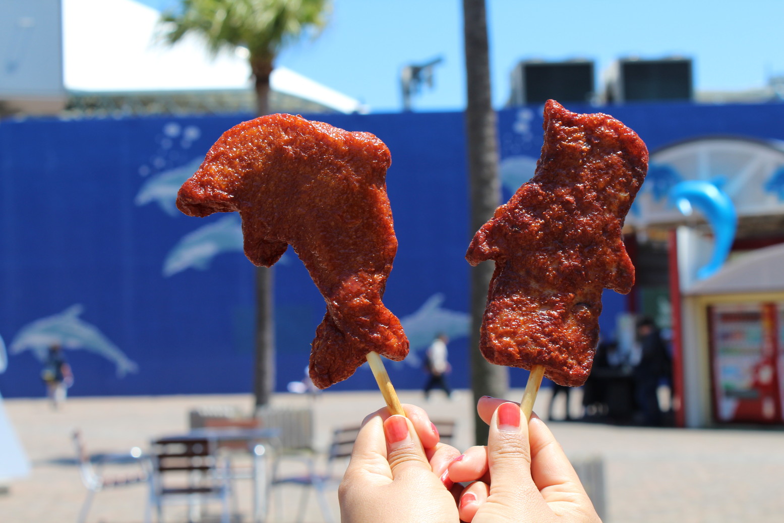 海の動物たちの形をしたあげかまは、エビ入りのイルカとピリ辛のペンギンの2種類がありました。子供にはやさしい味の、イルカがおすすめ!