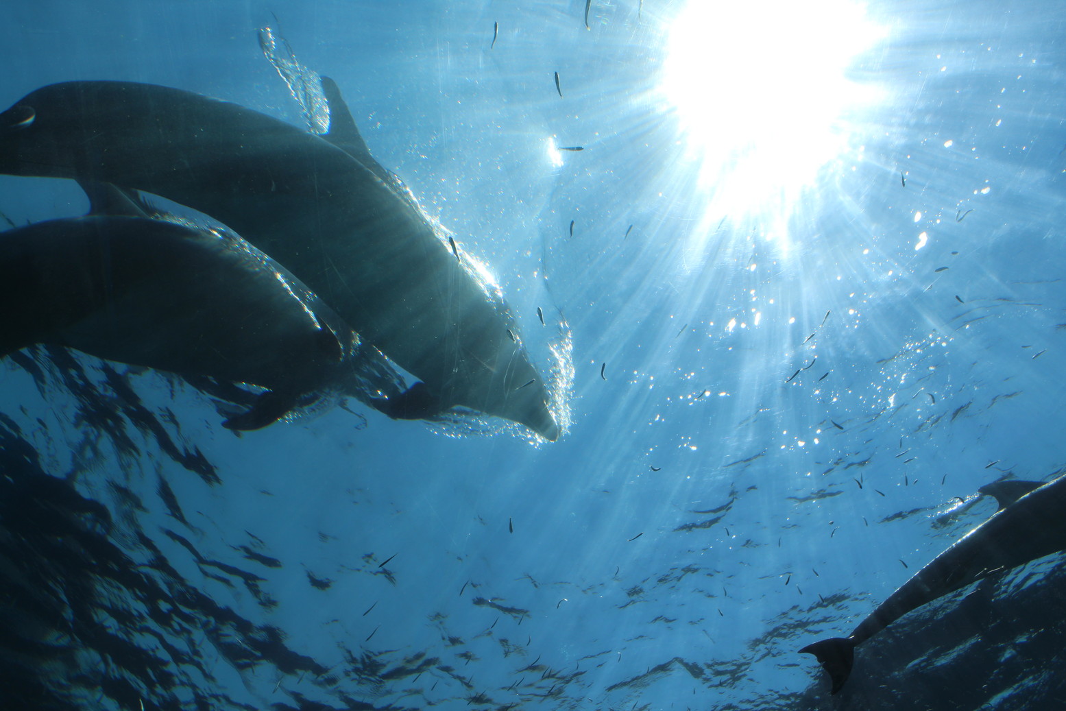 「ドルフィン ファンタジー」では、アーチ形の水槽でバンドウイルカが優雅に泳ぐ様子が見られます。屋根がなく太陽の光が水槽に直接差し込むため、水槽がキラキラと輝いて見えるんです。この美しさは、ここでしか体感することができません。