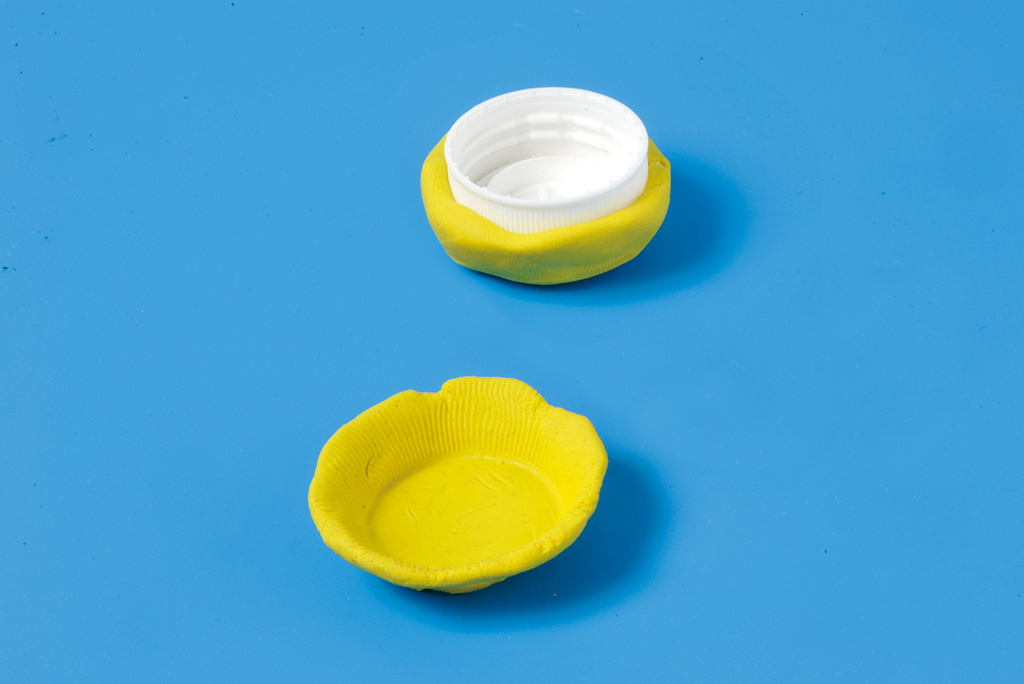 水から取り出したねり消しゴムに、ペットボトルのふたを押[お]しつけて外し、おわんのようなかたちに整える。