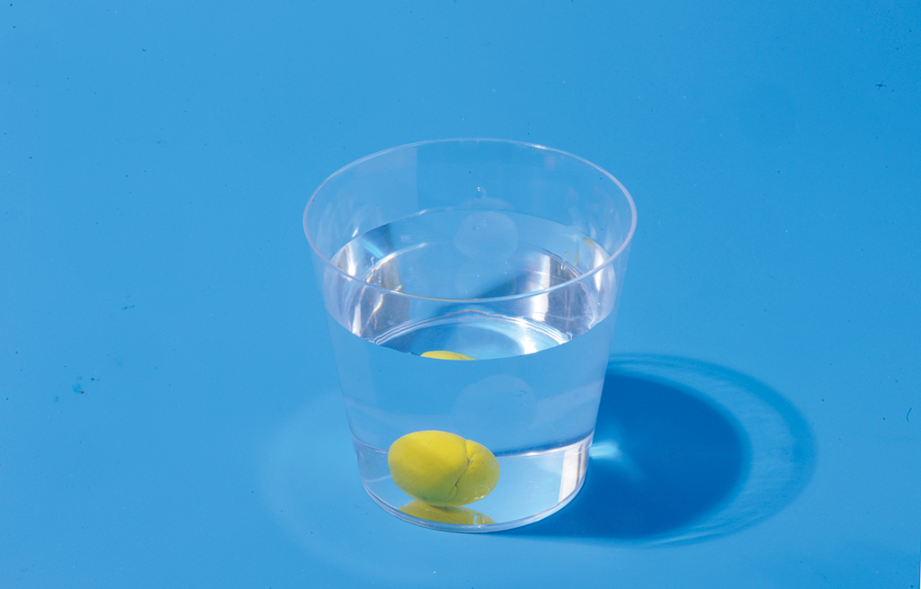 丸めたねり消しゴムを、水の入ったコップに入れるとどうなるか見てみる。