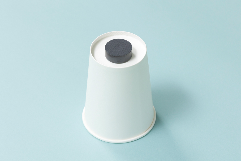 紙コップの底の中央に、磁石を両面テープで接着させる。
