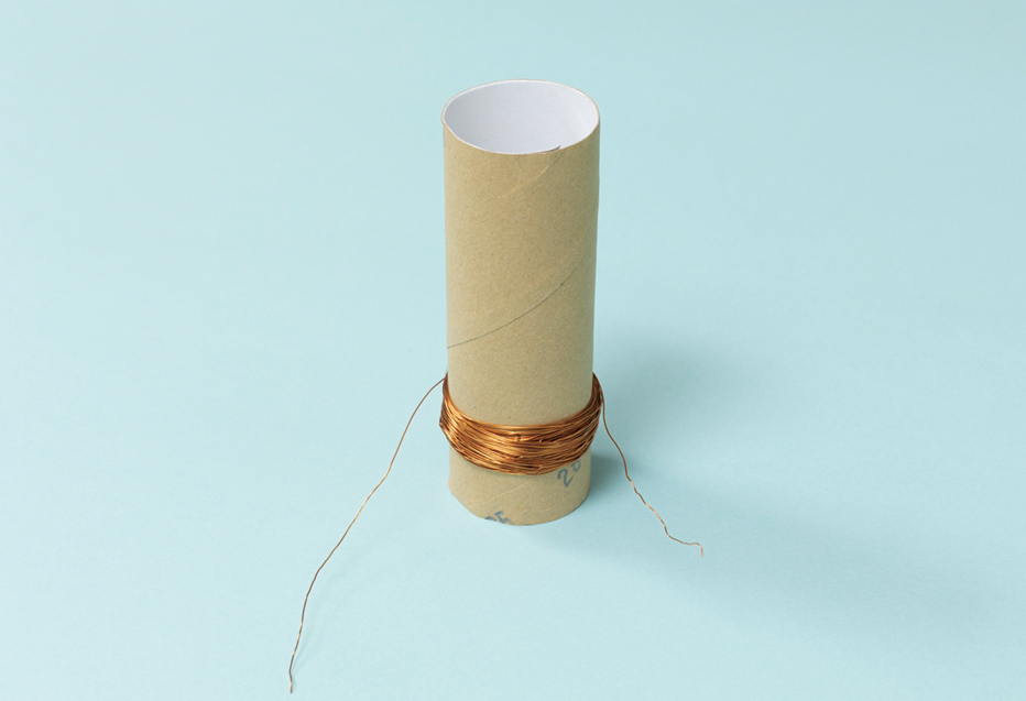 エナメル線をトイレットペーパーの芯[しん]の1㎝くらいのところに巻きつける。エナメル線は端[はし]を10㎝くらい残しておく。