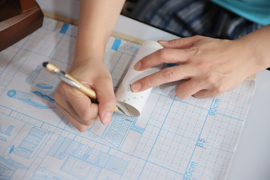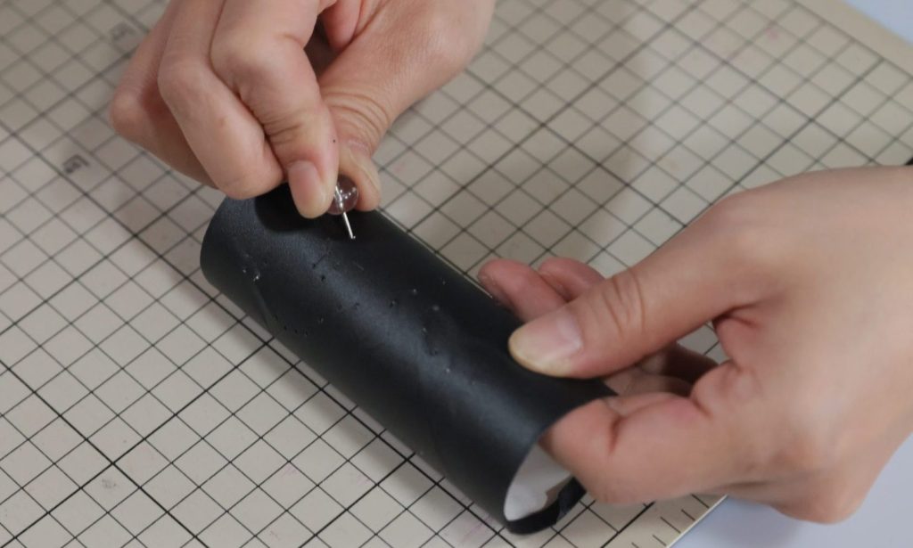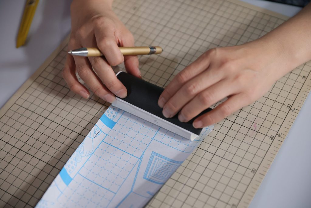 カッティングシートを裏側(シールになっている方)にして、トイレットペーパー芯をのせるよ。芯の両端[りょうはし]から1cm外側に線を引いて、長方形にカットしよう。