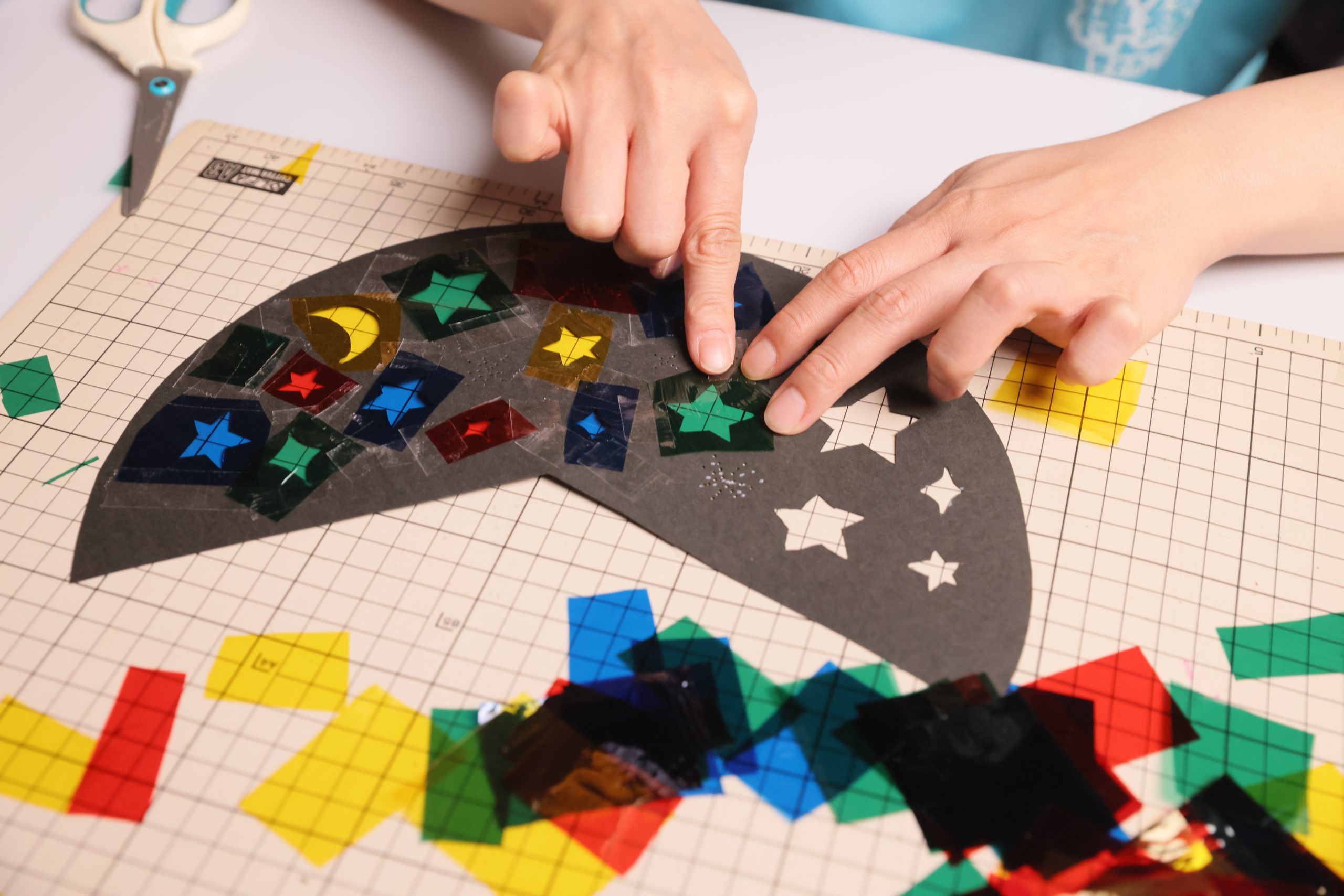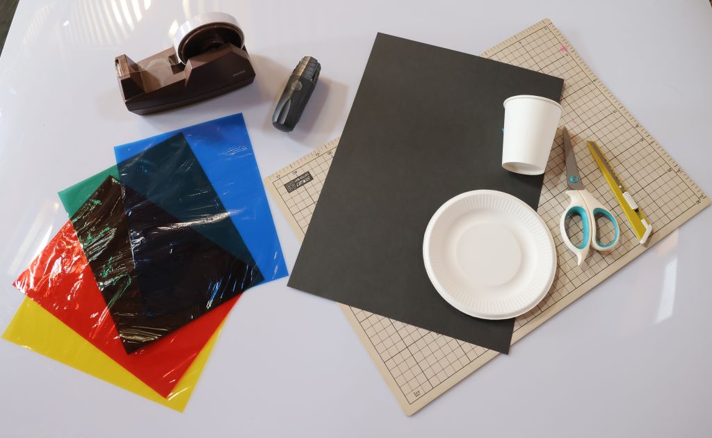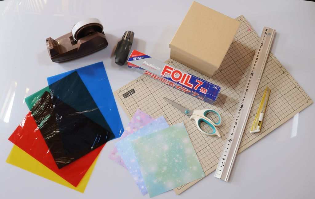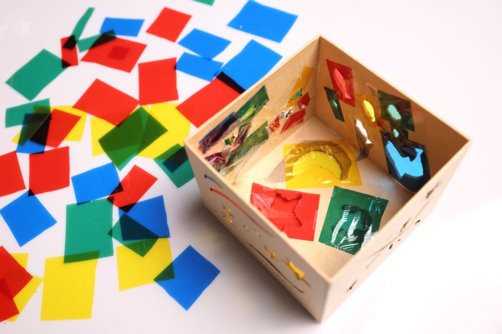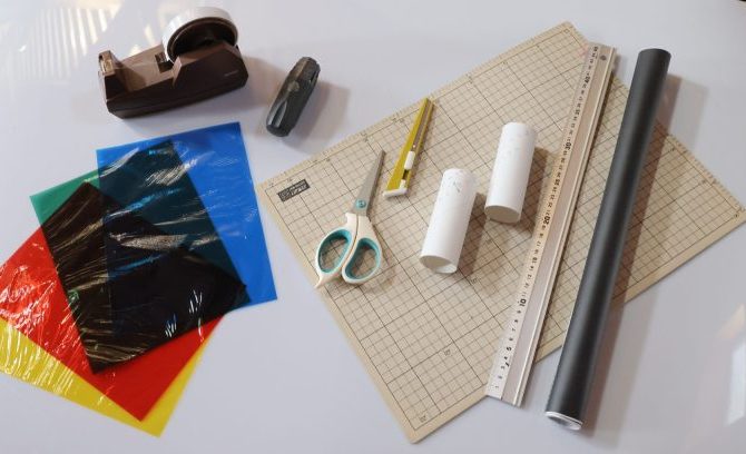 筒[つつ]の片方に好きな形をくりぬいた紙を貼ったらどうなるかな?筒の中にカラーセロファンを入れて照らしてみたら、どう見えるかな?試してみよう!