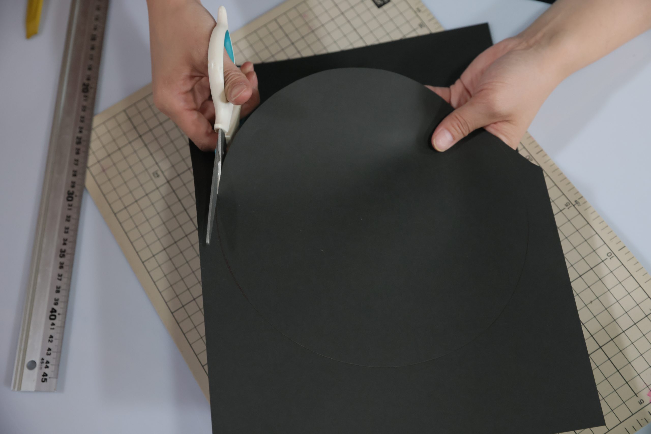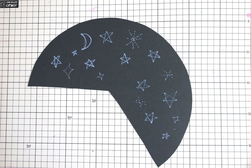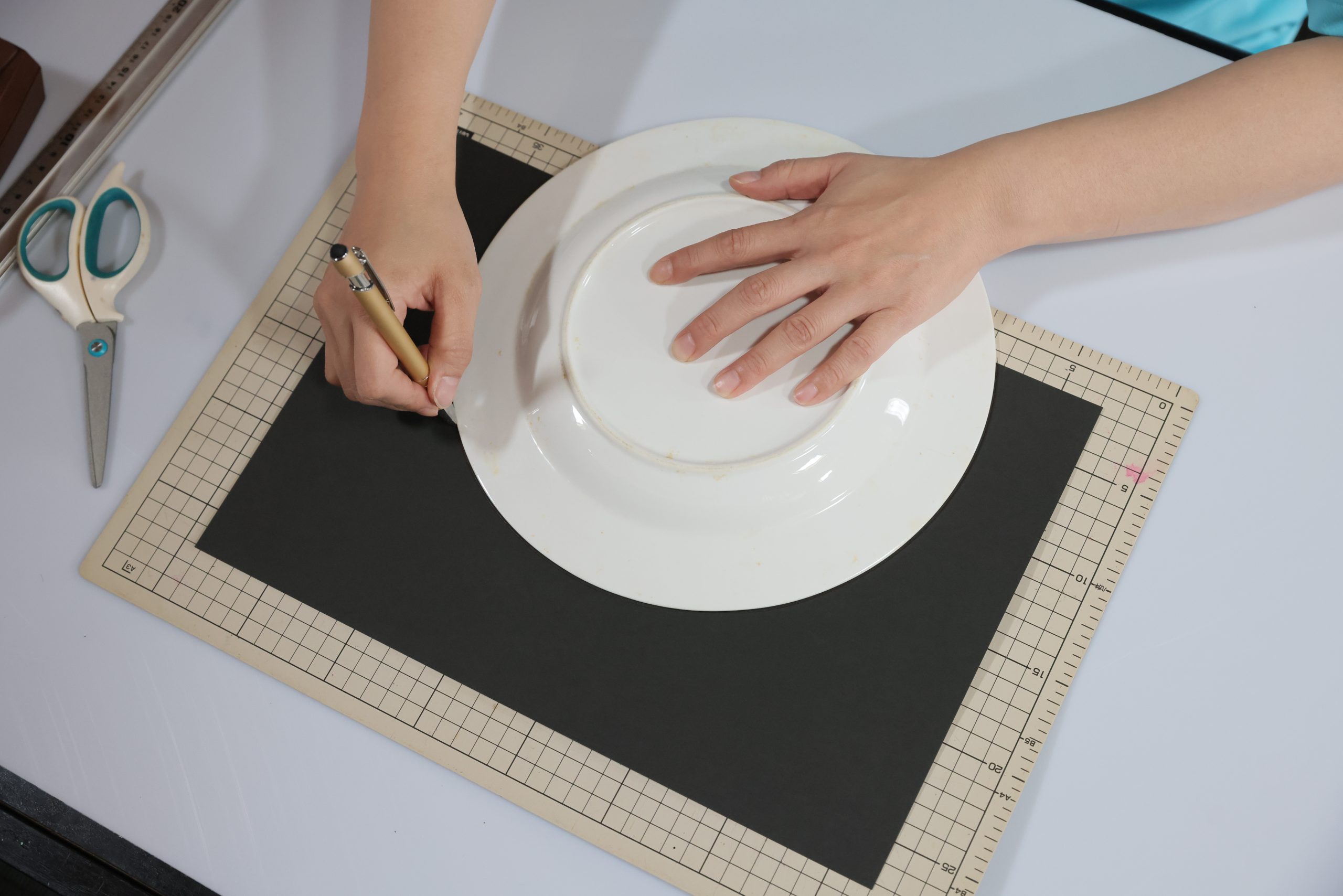 丸いお皿を、黒画用紙の上に少しずらして置いて、線でなぞろう。