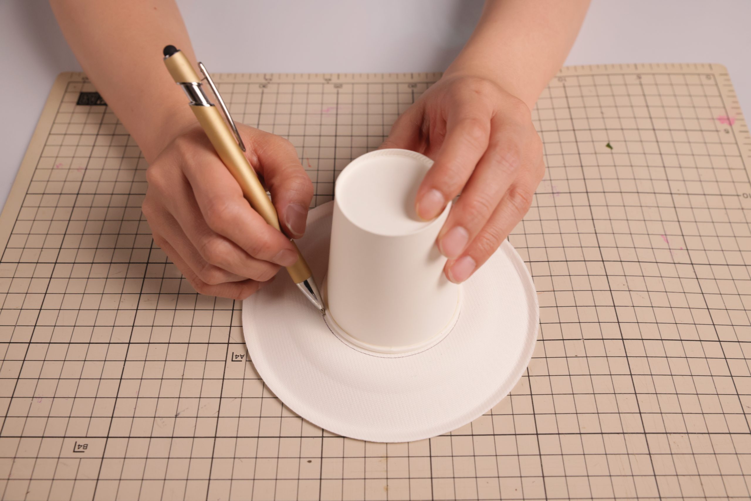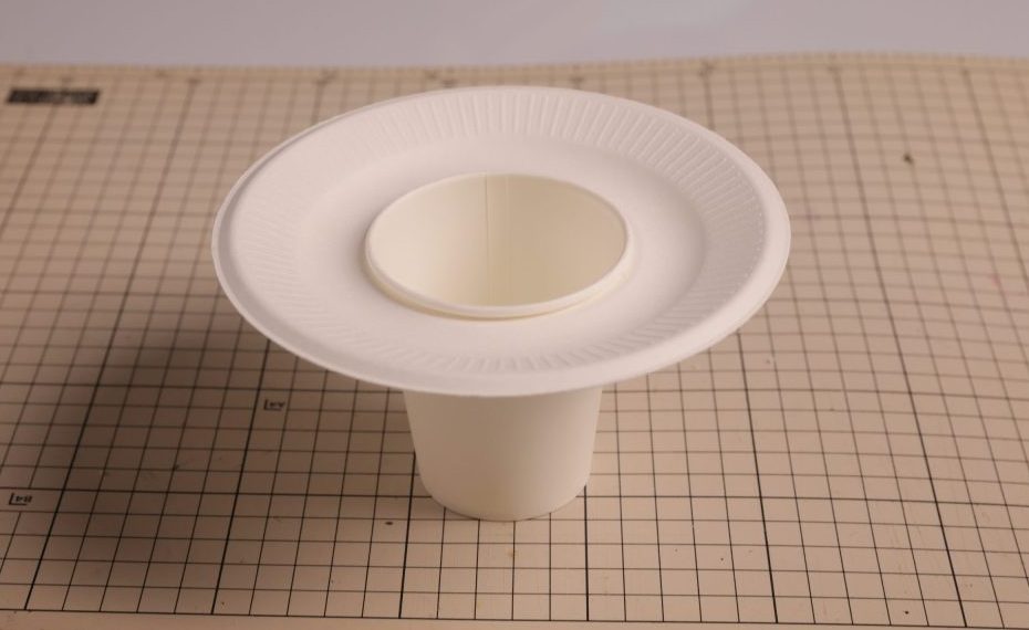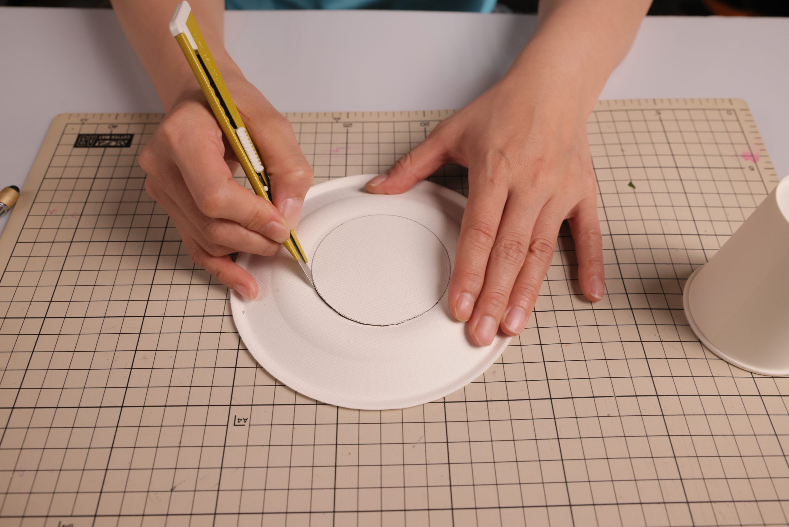紙皿の穴に、紙コップの口を差し込[こ]もう。