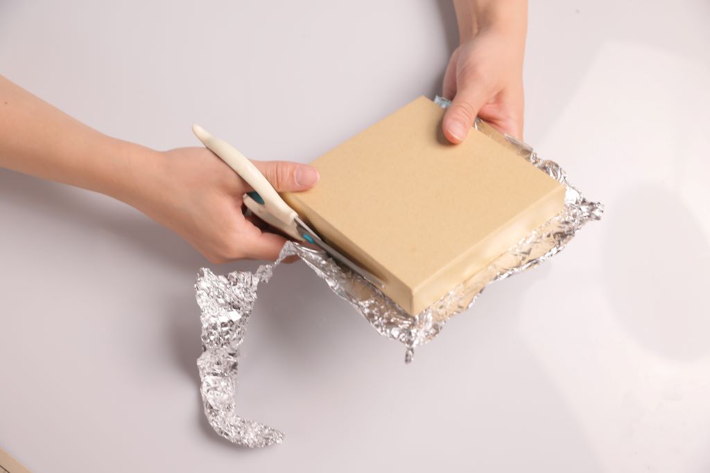 次に、芯全体を包める長さでカットしよう。芯を回転させて必要な長さの見当をつけるのがおすすめだよ。