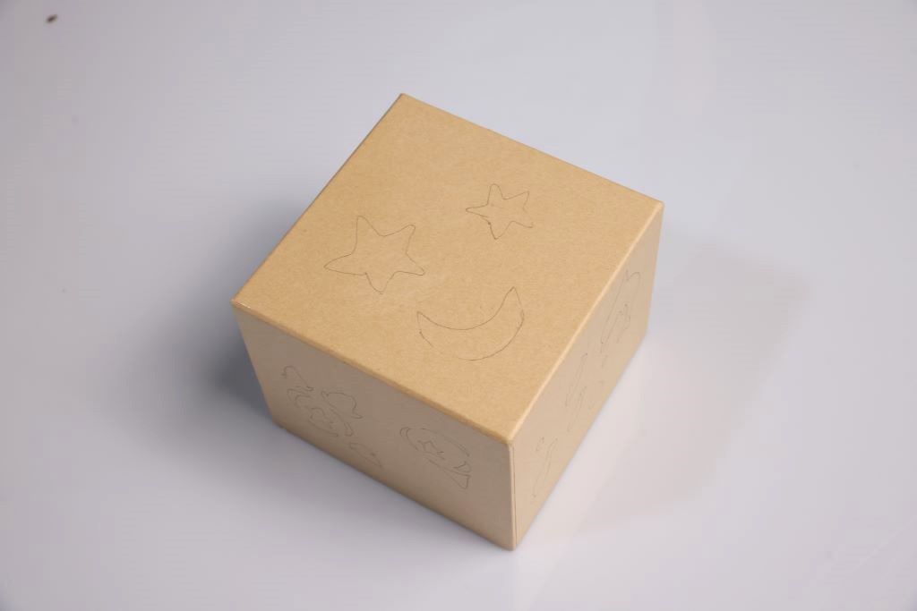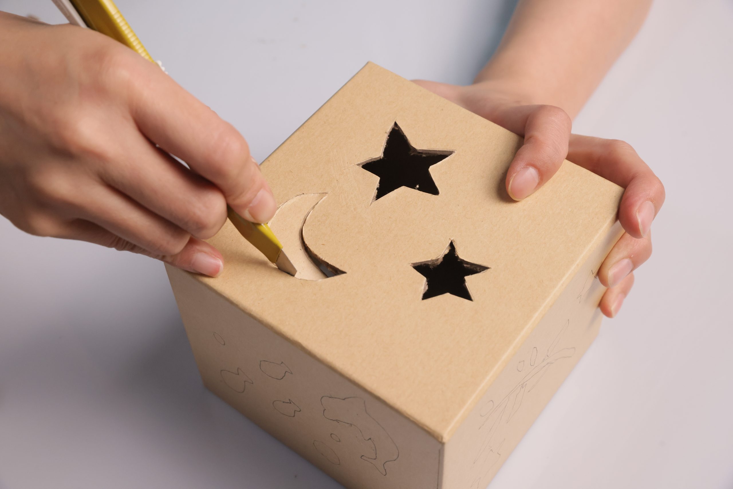 まず鉛筆で、箱に自由に下書きをしよう。箱の上だけでなく、側面にも描[えが]こう。星以外のイラストを描くのもおすすめだよ。絵を大きめに書くと、ダイナミックな投影[とうえい]が楽しめるよ。