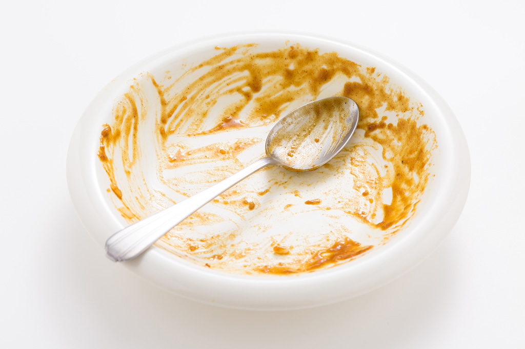 2枚のお皿は、同じ種類の汚れが同じぐらいついていると比較[ひかく]しやすいよ。カレーや、ナポリタンなどトマトソースの料理、から揚[あ]げなど油っぽい料理がおすすめ。