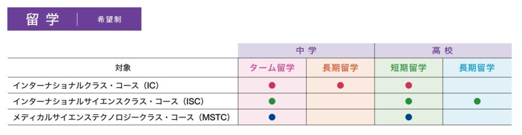 中学の長期留学(約8か月間)はICのみですが、高校の短期留学(約10日間)は全コースが対象となっています。また、インターナショナルサイエンス(ISC)は高校で長期留学(約10か月間)を用意。そのほかにも全コースが高校2年生で海外研修があり、ICはオーストラリア、ISCは台湾・カンボジア・フィンランド(選択制)、メディカルサイエンステクノロジー(MSTC)はシンガポールで学びを得ます。