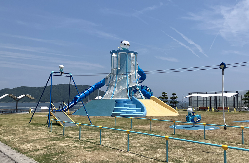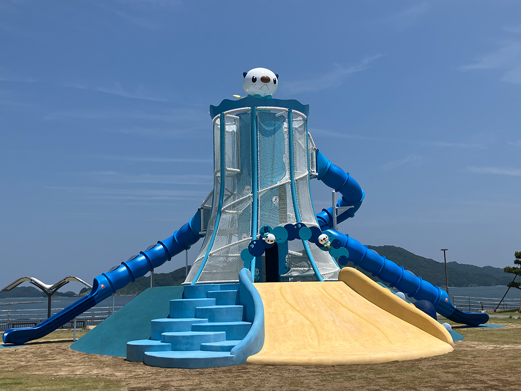 ミジュマルをモチーフにした遊具がユニーク。写真奥の複合遊具はチューブ状の滑り台などで遊べます。