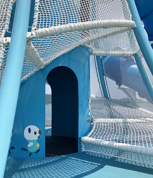 複合遊具の入り口にもミジュマルがいます。らせん状のネットを伝って上までのぼれますよ。