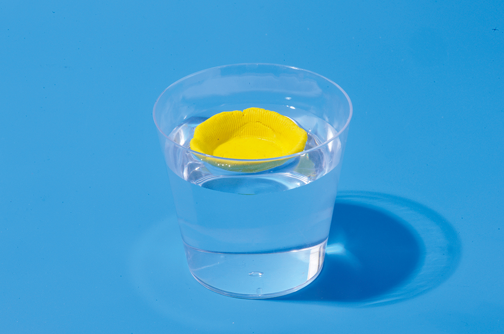 - 水から取り出したねり消しゴムに、ペットボトルのふたを押しつけておわんのようなかたちに整える