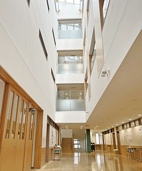 前校長先生の蔵書2,000冊が並ぶこの空間は、生徒たちがカーテンや床の色選びから参加して作り上げた、まさに「生徒と一緒に作った」空間です。ここで自習したり、探究活動をしたり。ガラス張りの明るく自由な雰囲気からも、居心地の良さが伝わってきます。