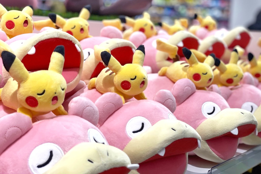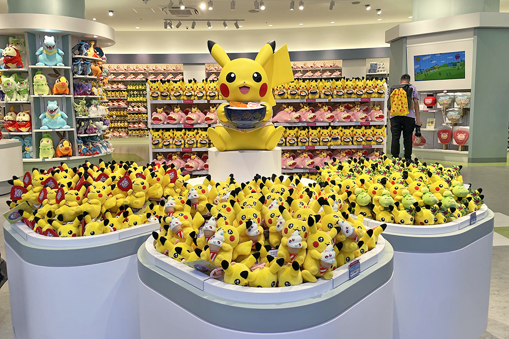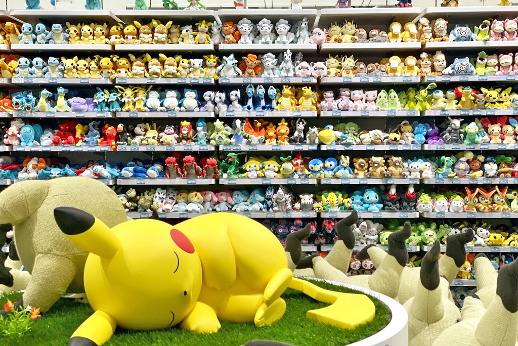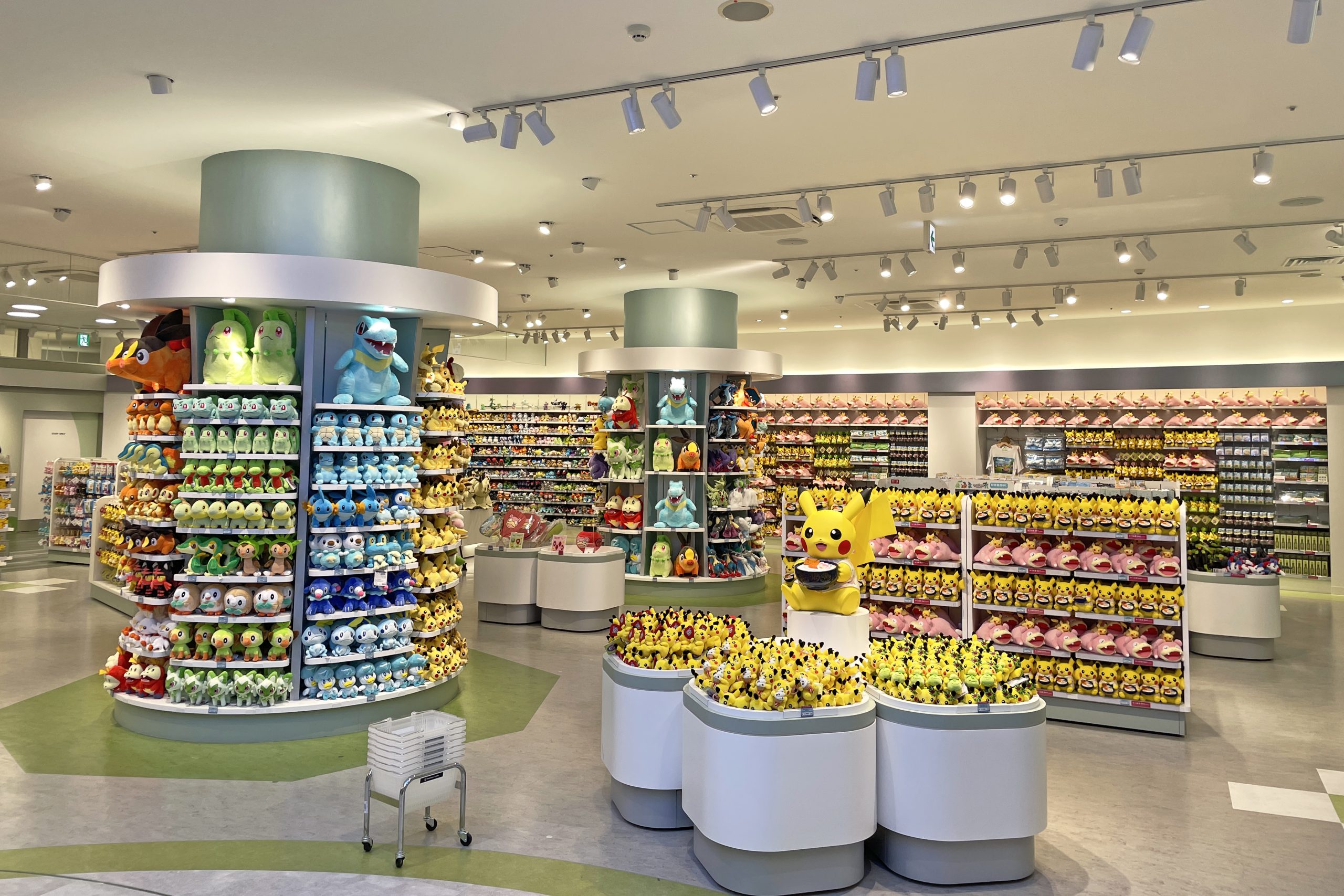 店内には、各種ぬいぐるみをはじめ、数えきれないほどのポケモン関連のアイテムがずらりと並んでいます。オフィシャルショップならではの圧巻のボリューム!思い思いに過ごすポケモンたちの姿が、ディスプレイのあちこちで見られます。