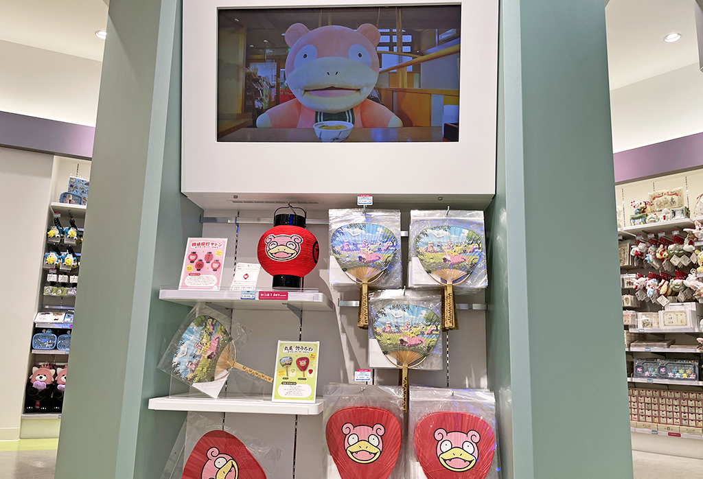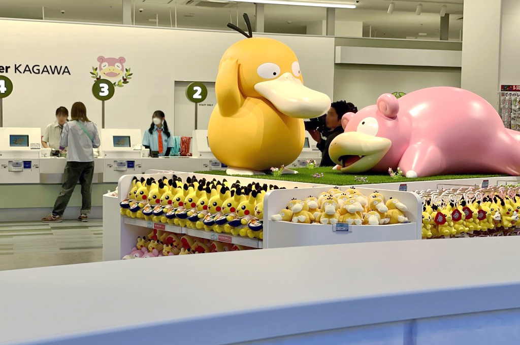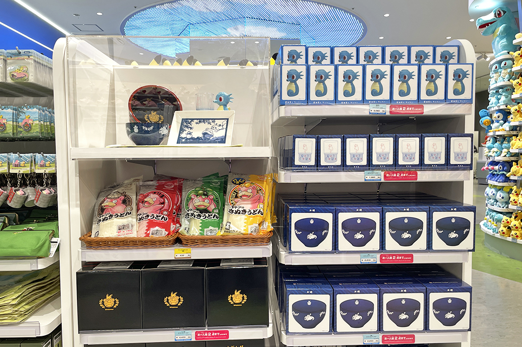 ヤドンは、香川の名物グルメ・うどんと語呂が似ていることから2018年に「うどん県PR団」に任命。ポケモンセンターカガワでは、ヤドンをメインにしたモチーフで店頭や店内が彩られています。