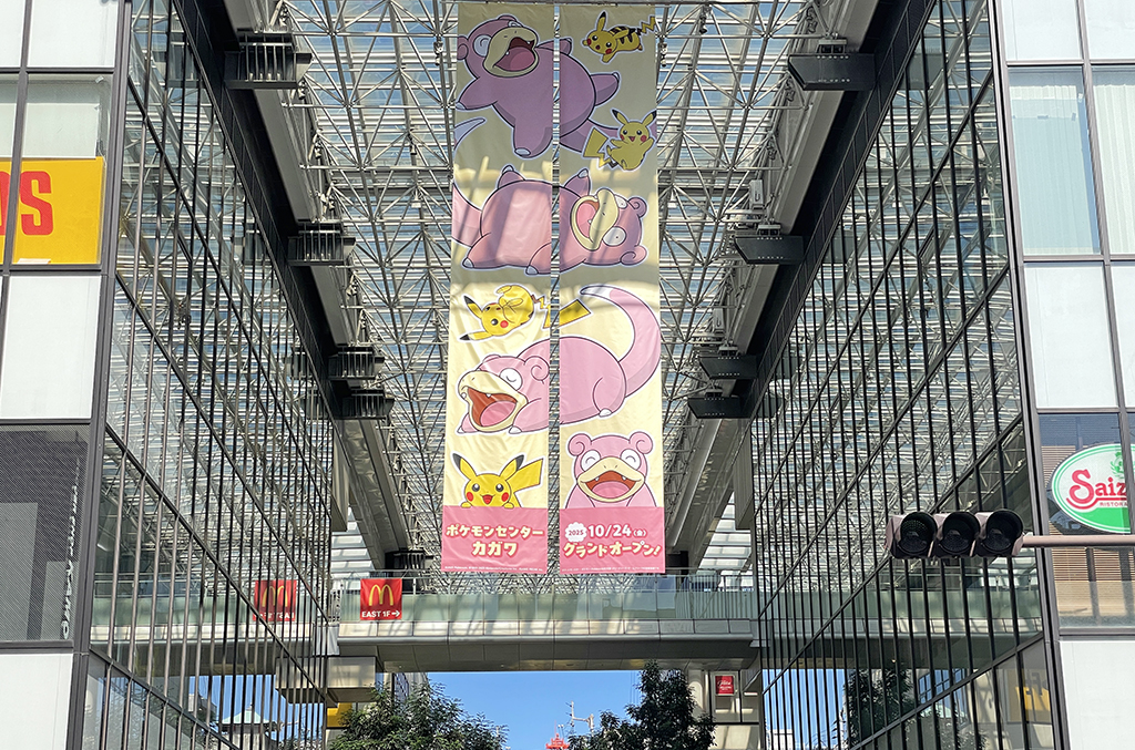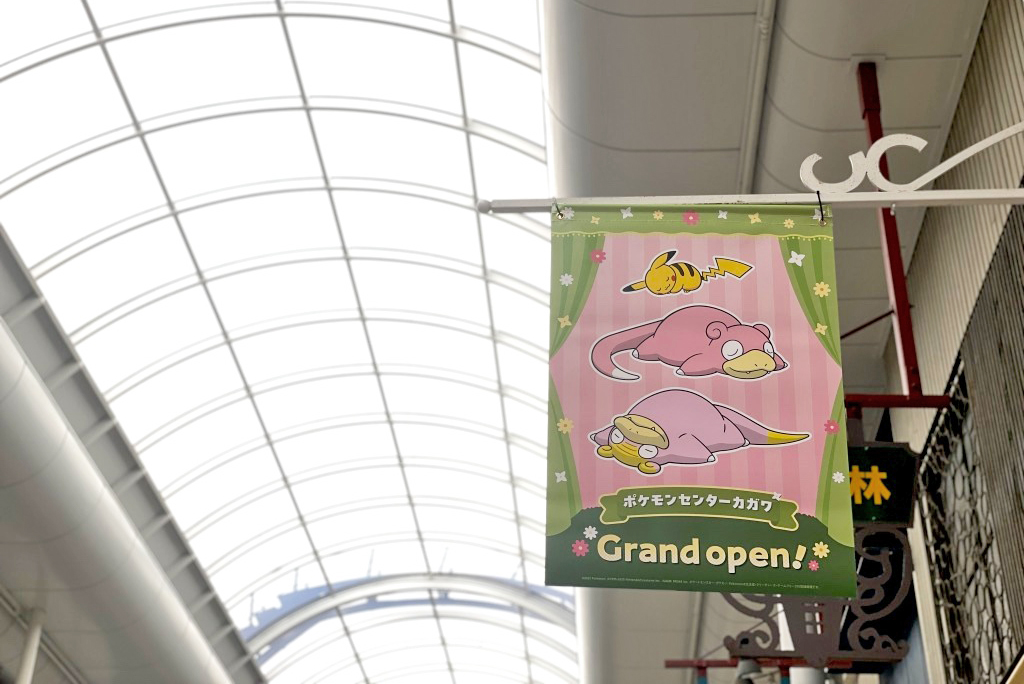商店街周辺にはオープンを記念したフラッグが見られるなど、まちは大盛り上がり!ポケモンセンターに着くまでの道のりでもテンションが上がります。