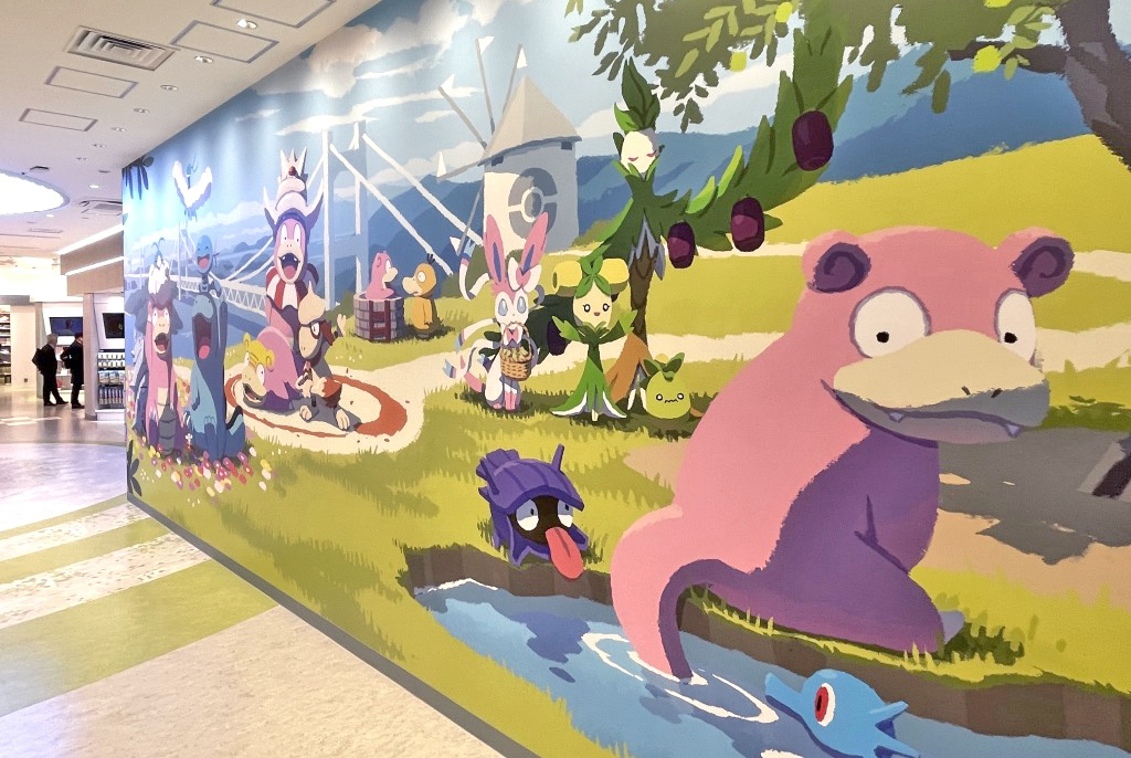 早速入店してみましょう!エントランスへ続く壁には、ヤドンをはじめとするポケモンたちが、香川をイメージした風景のなかで過ごしているアートが描かれています。