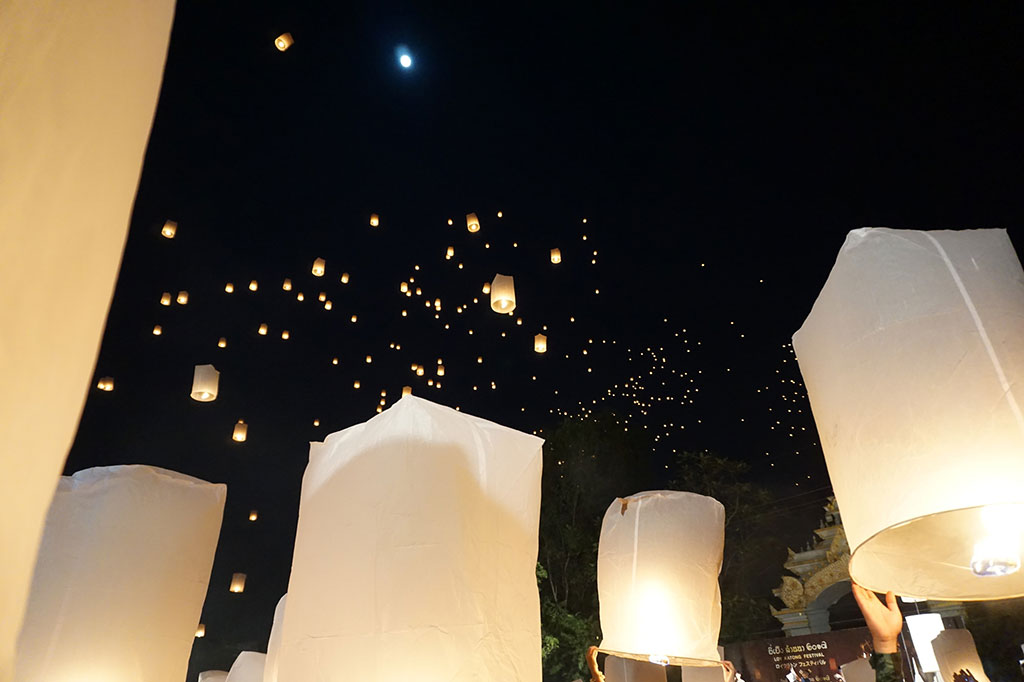 タイ全土で行われる「ロイクラトン」は、毎年陰暦12月(新暦10月~11月頃)の満月の夜に行われる仏教のお祭りです。美しく飾った灯籠を川に流し、コムローイと呼ばれるランタンを空に放ちます。