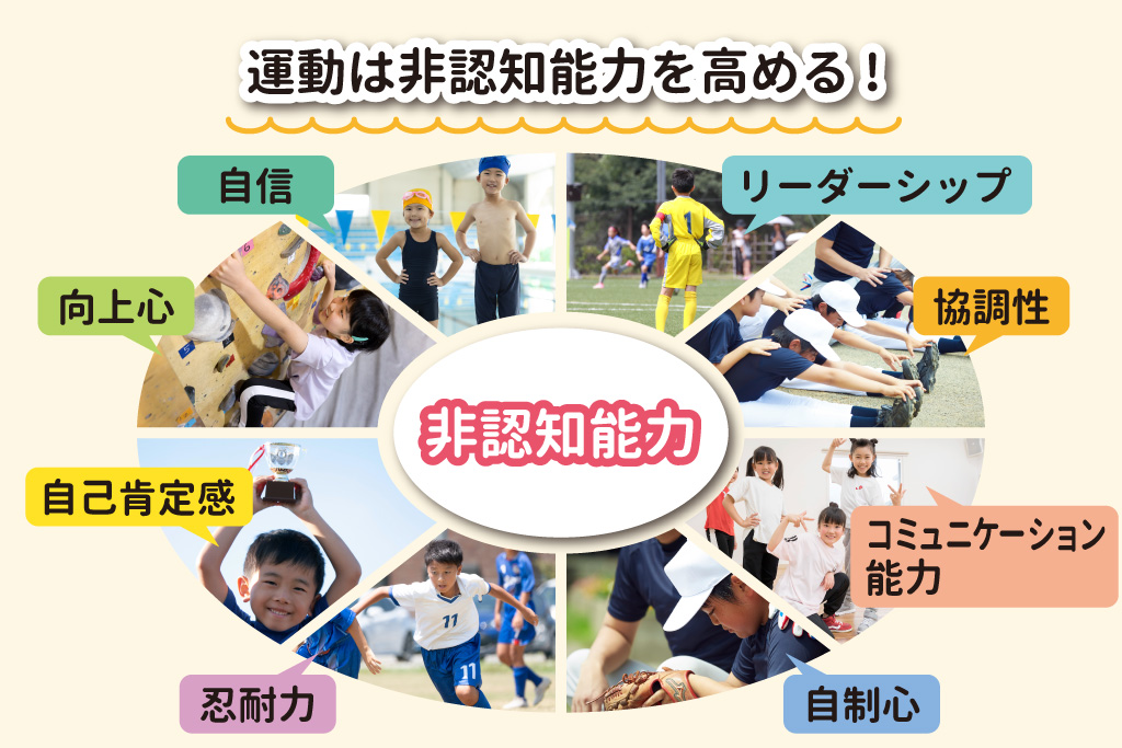 運動・スポーツ競技には、身体的な運動能力だけではなく、忍耐力や、自信、コミュニケーション力、協調性、社交性などといった、あらゆる非認知能力を育む要素があります。