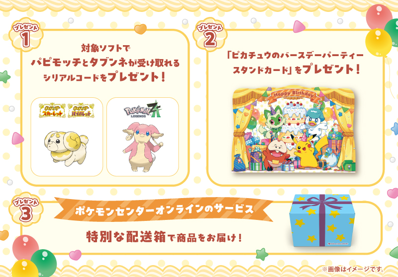 全国のポケモンセンターと同じく、対象ソフトでパピモッチ1匹とタブンネ1匹が受け取れるシリアルコードと、「ピカチュウのバースデーパーティースタンドカード」をプレゼント。
