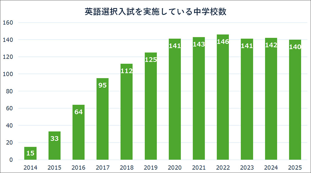 首都圏の公立・私立中学校では、英語を評価対象とする入試(英語選択・帰国生以外)を導入する学校が年々増加しています。