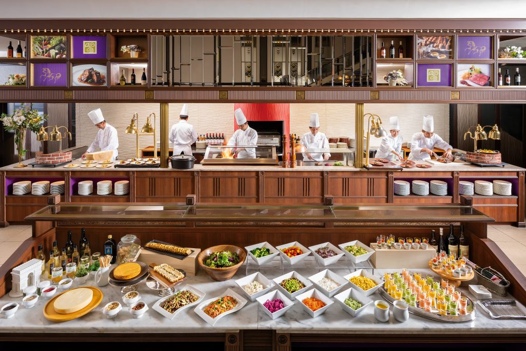 シェフが目の前で料理を仕上げてくれるライブキッチン。職人技にワクワク!