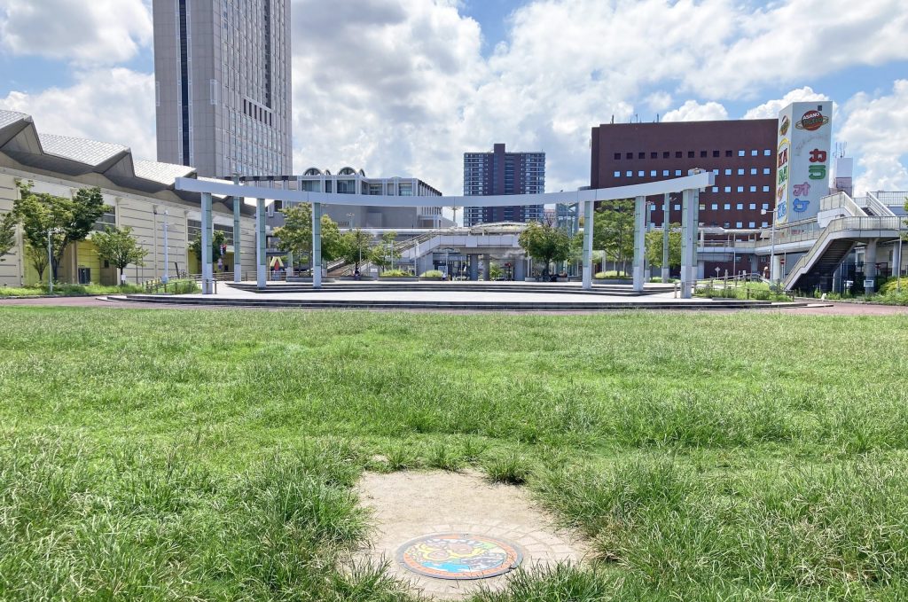 芝生の中に設置されているのが「トロッゴン」と「アローラダグトリオ」のポケふた。北九州市の花はひまわりなんです。