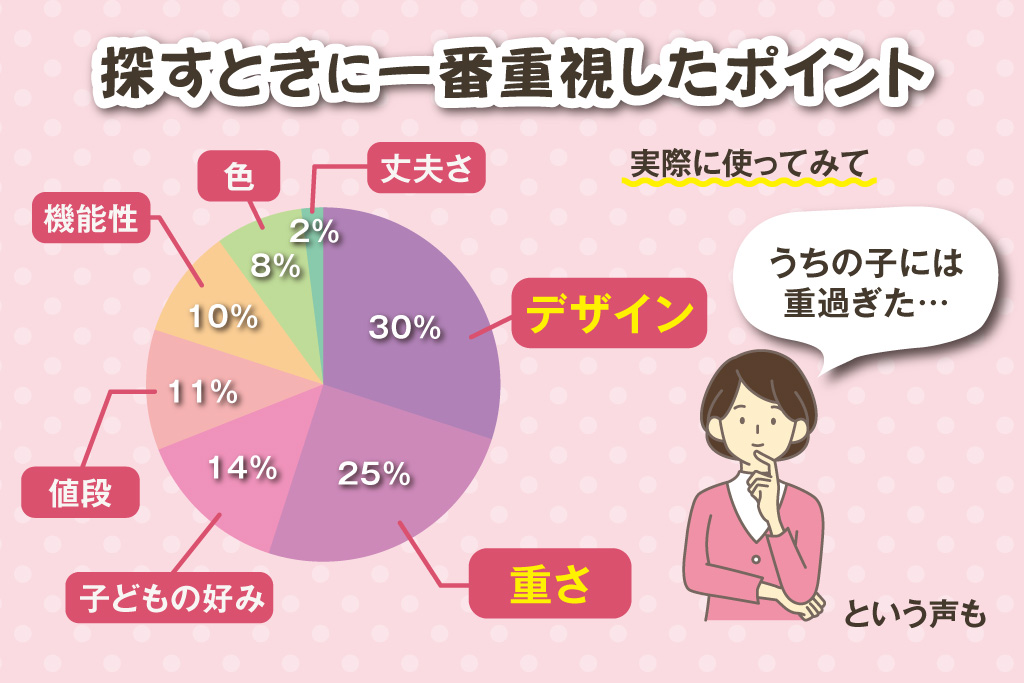 先輩ママパパがランドセルを購入時に重視した点としては、「重さ」と「デザイン」で50%以上。一方、購入後に気になったことを聞いてみると「荷物を入れてみると、思っていた以上に重かった」という声が多く、重さを重視して選んでもなお、登校時の子どもの負担を案じる家庭は多いようです。