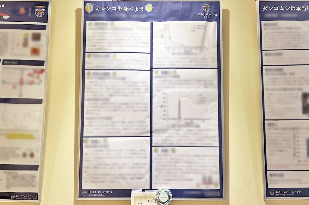 ちなみに廊下には、生徒たちが理科の授業で取り組んだ研究成果がポスター形式で貼り出されています。「ミジンコを食べる」というユニークなテーマも。中学生は自分で研究テーマを決め、半年かけてまとめます。