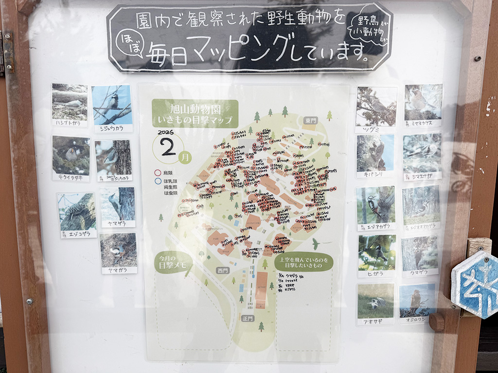 ペンギンやホッキョクグマなど動物が生き生きとした姿を見せる、独自の「行動展示」で全国から注目の動物園。シマエナガの飼育はしていませんが、多くの野鳥が見られる旭山に立地するため、よく園内にも遊びに来ているようです。園内に設置されている、その日目撃された野生動物を記した「いきもの目撃マップ」はほぼ毎日更新されているそう!シマエナガグッズも多数取り揃えられています。