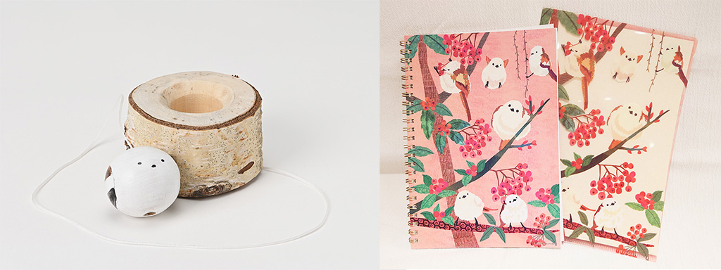 左/【Toridori】木のシマエナガ カップけん玉(3300円)、右/【COMO】シマエナガとナナカマド A5リングノート(660円)&A5クリアファイル(330円)