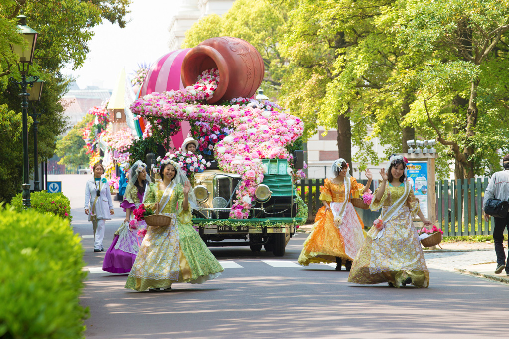 季節の訪れを祝うフラワーパレードが1日1回、入国ロータリーから花の広場まで行われます。華やかなドレスを着た街の住人たちによるパレードの後は、ヨーロッパの伝統的なダンス「メイポールダンス」。誰でも参加できるので、街の人たちに混ざって一緒に踊りましょう。