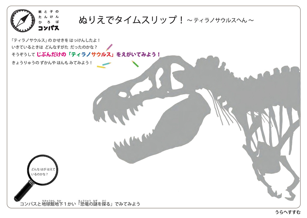 地球館の3階にある「親と子のたんけんひろば コンパス」は、主に4~6歳の子どもと保護者を対象にした展示室。ここで配布しているワークシートの一部をウェブサイトで公開。ダウンロードして印刷すれば、おうちで楽しむことできます。恐竜のぬりえやおりがみ、ちぎり絵、たからものあつめなど、いろいろな種類が揃っています。親子でチャレンジしてみましょう。