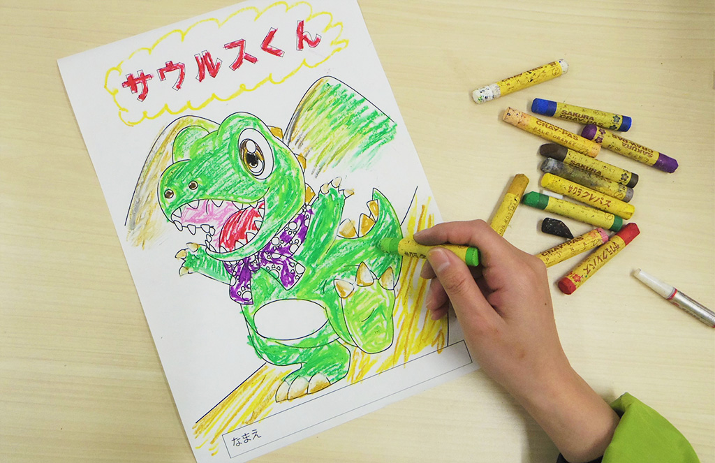 マスコットキャラクターのサウルスくんや恐竜センターに展示している恐竜のぬりえがあります。