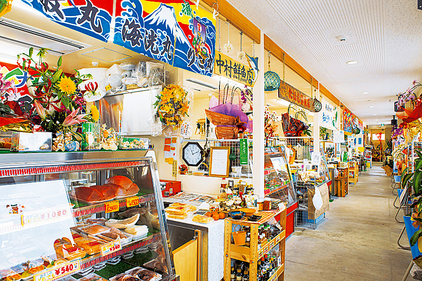 目の前の漁港で水揚げされた鮮魚をはじめ、奥武島(おうじま)で養殖したモズクやアーサ(アオサ)、海ぶどう、コーヒーやEMアイスクリームなどを販売している市場。海鮮丼600円~や新名物のフィッシュサンド250円~は、2025年6月にオープンする海を望む飲食スペースでいただけます。島発着の海底観光グラスボートの乗船券(大人1500円、4歳~小学生750円)も販売しています。