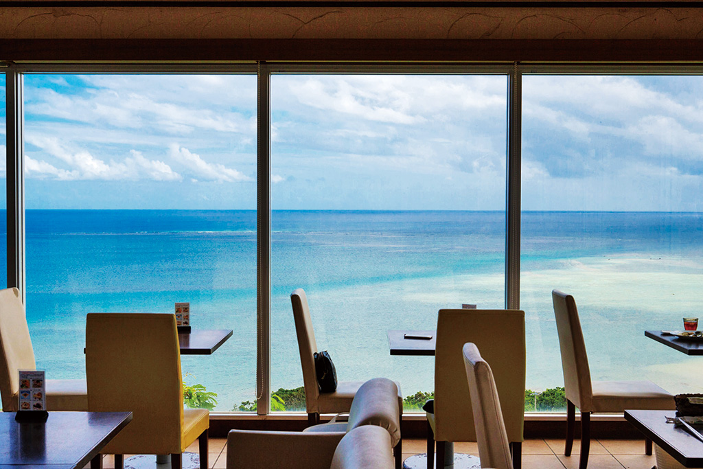 大きな窓から周囲の美しい景色を見渡せる、居心地の良いカフェ。沖縄県産豚のポークソテー2160円や、ベジタコライス1440円などを提供しています。