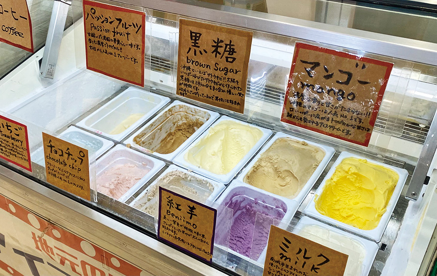 南城市や神の島・久高島(くだかじま)の特産品をはじめ、みやげ品や地元農家の野菜、海の幸などがずらり。EM玉城牧場牛乳を使ったEMアイスや、物産館オリジナルの黒糖塩まんじう9個入1650円も人気。斎場御嶽のチケット販売所や南城市観光協会も併設されています。