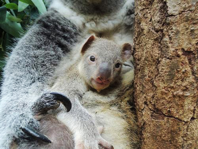 コアラの妊娠期間は約35日。1カ月ちょっとで出産して、そのあと半年間はお母さんの袋の中にいます。この袋のことを育児のう、あるいはコアラポケットと呼びます。袋を出たあとも4カ月くらいはお母さんにくっついているので、その期間が親子でいる姿を見るチャンスです。