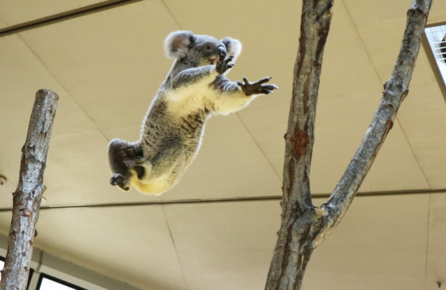 コアラは群れはつくらず、1頭で生活をします。縄張り意識が強いのが特徴で、自分の縄張りにほかのコアラが入ってきたら歯をむき出して威嚇するようです。見た目とは異なり、けっこう怖いんです。また、かなり繊細で神経質なので、コアラとのふれあい、というイベントは日本では実施してないんですね。