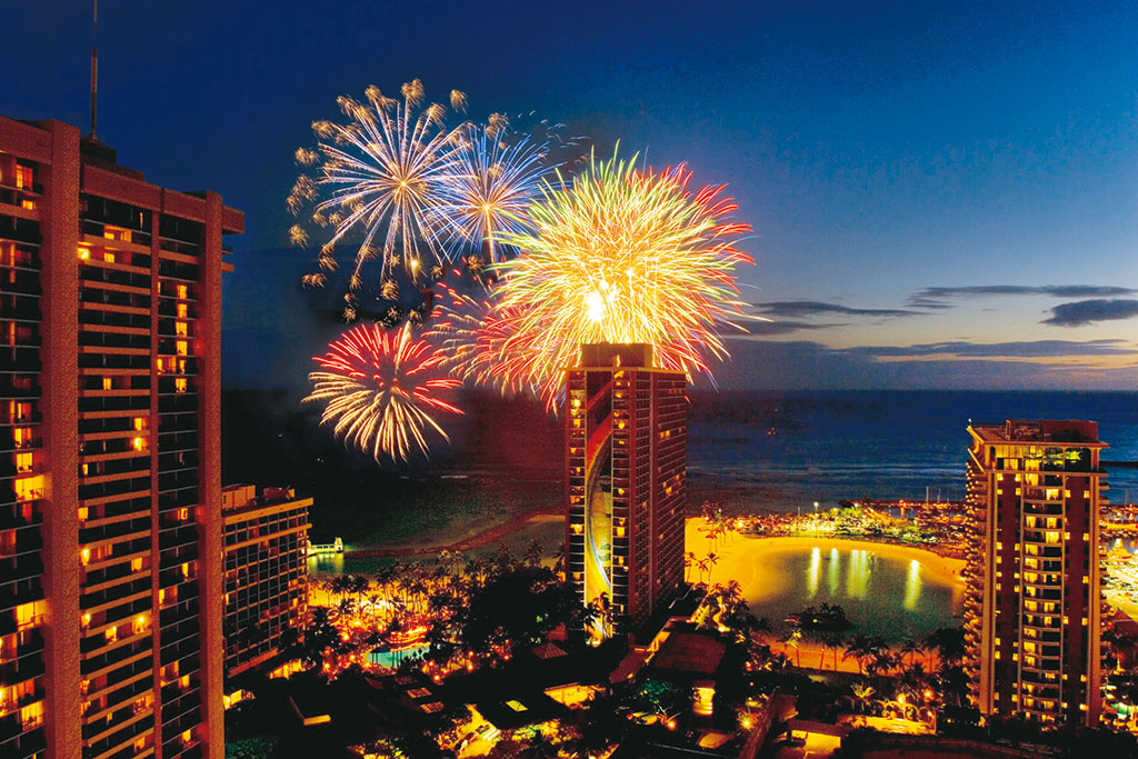 ホテルで夕食。金曜の夜ならヒルトン・フライデー花火ショーを鑑賞も。ヒルトン前のビーチからなら頭上で開く大輪の花火を見ることもできます