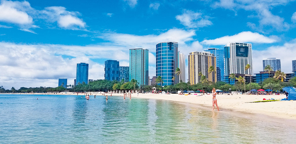 アラモアナセンターの海側に位置するアラモアナ・ビーチ。ワイキキほど混雑することも少なく、地元の人たちで賑わっています。