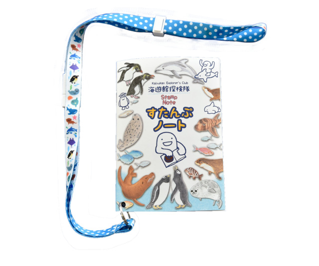 子どもたちがより海遊館を楽しみ、生きもののことをよく知れるようにと、スタンプが押せるノートを販売中。シルエットを見てどの生きものか探し、スタンプを押すとこたえの生きものがわかる仕掛けになっています。海遊館の生きものをモチーフにしたかわいいネックストラップ付きです。
