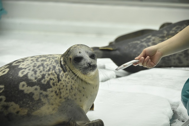 「北極圏」水槽のワモンアザラシは、お食事タイムになると一斉に飼育員の元へ集まってエサをねだります。ポヨンポヨンと歩み寄る姿がなんとも愛らしいです。